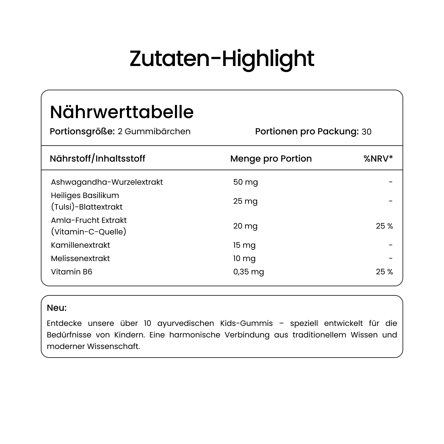 - Each daily serving of 2 gummy bears provides a total of 120 mg of plant extracts, including ashwagandha root extract, holy basil (Tulsi), amla fruit extract, chamomile extract and balm extract, supplemented with vitamin B6.