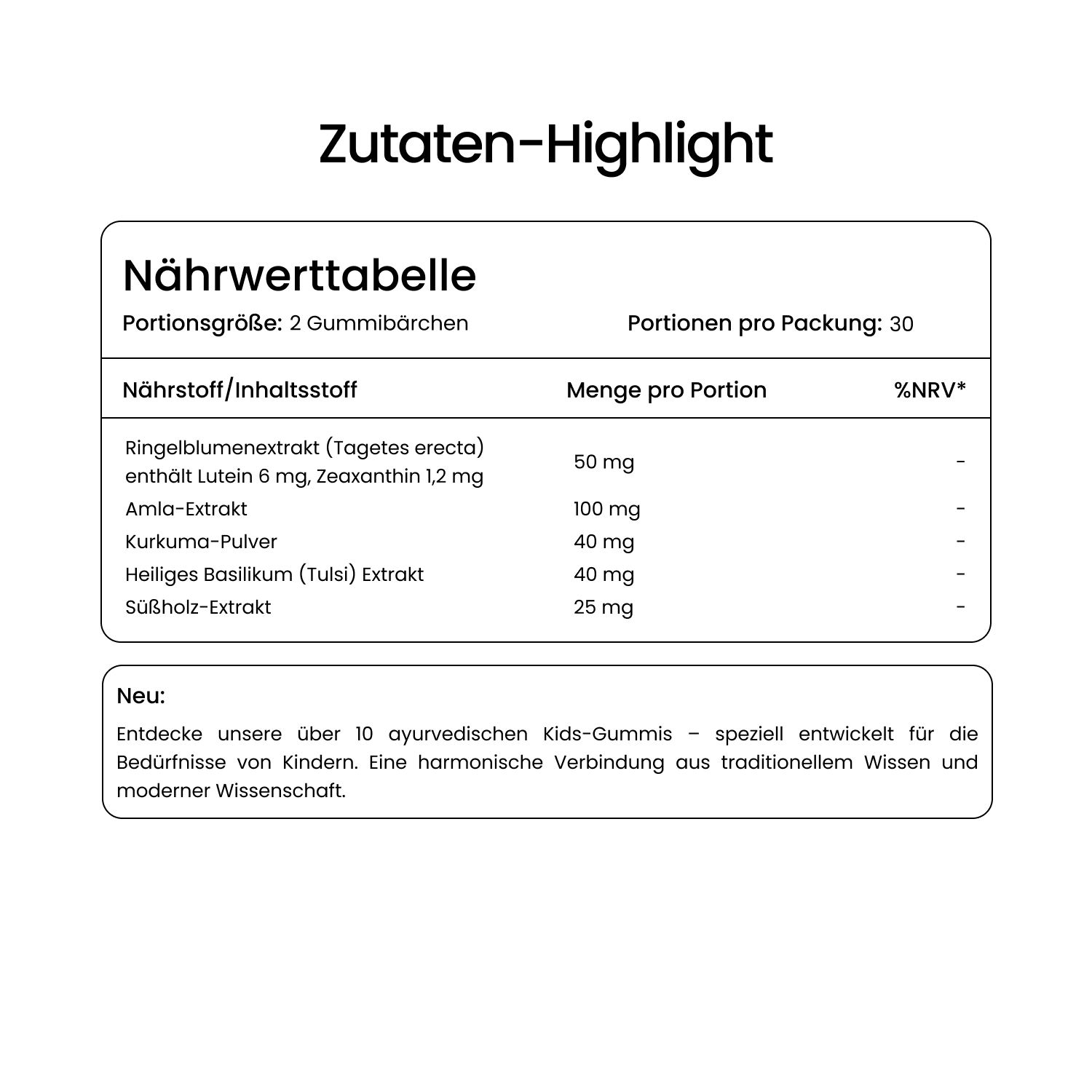 - Ayurveda complex (255 mg) - We combine modern science with ancient knowledge. In addition to lutein, each bear contains a powerful Ayurvedic mix of Amla (Indian gooseberry), turmeric, holy basil (Tulsi) and licorice. These plants are traditionally used in Indian teaching to support general well-being.