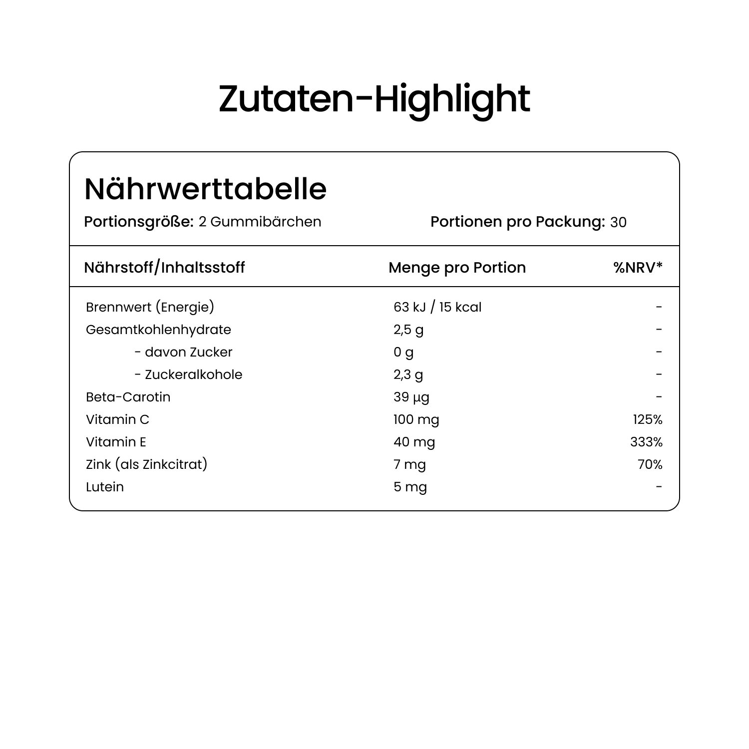 Contains a blend of lutein (5 mg) and beta-carotene (39 µg) per daily serving (2 gummies), supported by vitamin C (100 mg / 125% NRV), vitamin E (40 mg / 333% NRV), and zinc (7 mg / 70% NRV as zinc citrate).